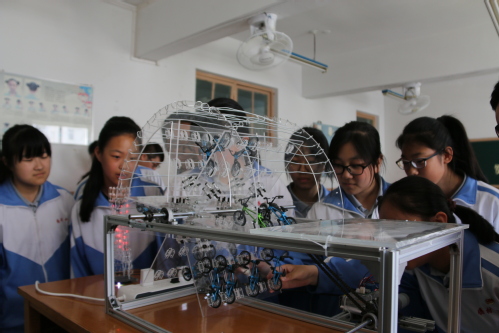 启动仪式结束后,“拥抱智能新时代 青春接力共成长”智能科普课堂开始。来自开云官方官网登录入口的师生给中学生们带来了学校机器人创新实验室和全国机器人大赛获奖作品展示。智能自主飞行无人机系统,仿生爬坡机器人,拳击、舞蹈、竞速机器人,智能垃圾桶、旋转式自行车停放装置、立体停车车库一一闪亮登场,赢得现场中学生的阵阵喝彩声。大学生现场向中学生介绍机器人基础知识、结构原理和实际应用,并操控机器人进行各种动作展示,通过直观的现场演示和深入浅出的讲解,激发中学生对科技知识的学习兴趣,提高中学生扎实掌握数理化基础知识的积极性和主动性。