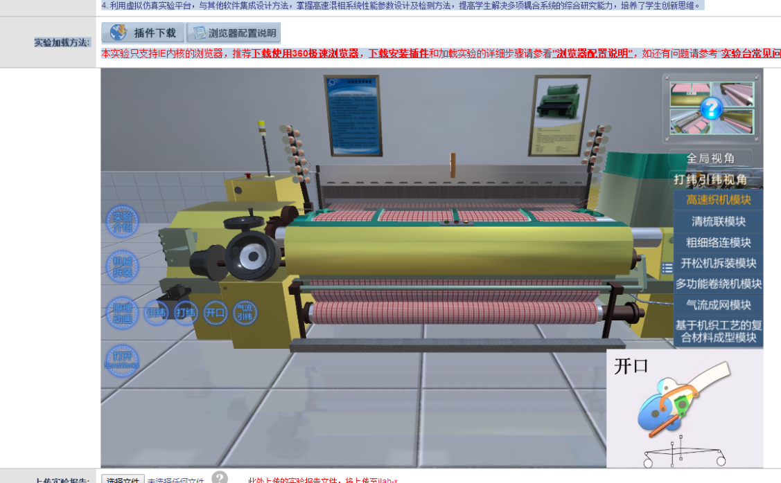 机械工程卓越16级学生进入国家虚拟仿真实验教学项目平台,注册,完成登录注册后进入平台。通过选择不同模块、填写申请报告,进入实践环节。针对织机类毕业设计课题,开展织机原理、结构特征及三维仿真实验等毕业实习和毕业设计实践教学环节。