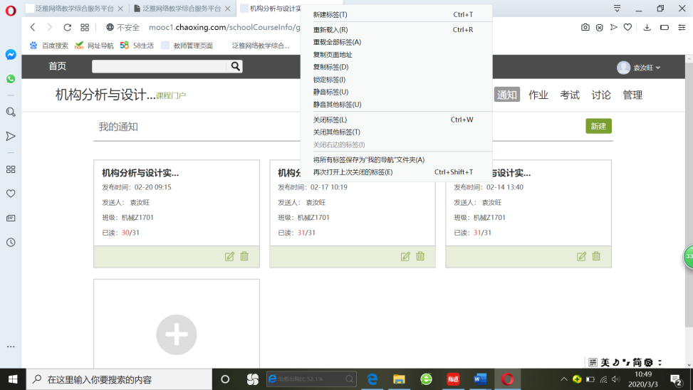 线上教学组织:通过学习通和微信等线上教学工具进行教学任务和通知下发,针对教学高峰期平台故障做好预案,采用腾讯视频会议与学习通同步教学,同时将全班同学分成4组并建立微信群,开展组内小范围教学与交流讨论。