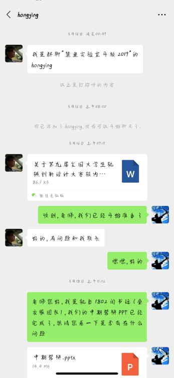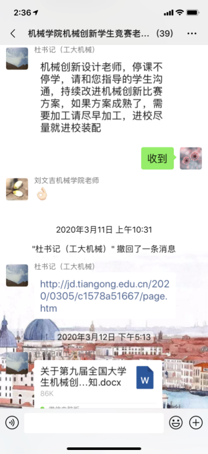 停课不停学,求知不停步。师生共同体,交流促成长。机创竞赛的参赛学生贾明军说道“特殊时期,感谢老师能时时刻刻陪伴在我们身边,督促我们小组查漏补缺,完善设计方案,对我们进行细致、及时地指导。我们要积极调整心态,为开学后参赛做好准备。”