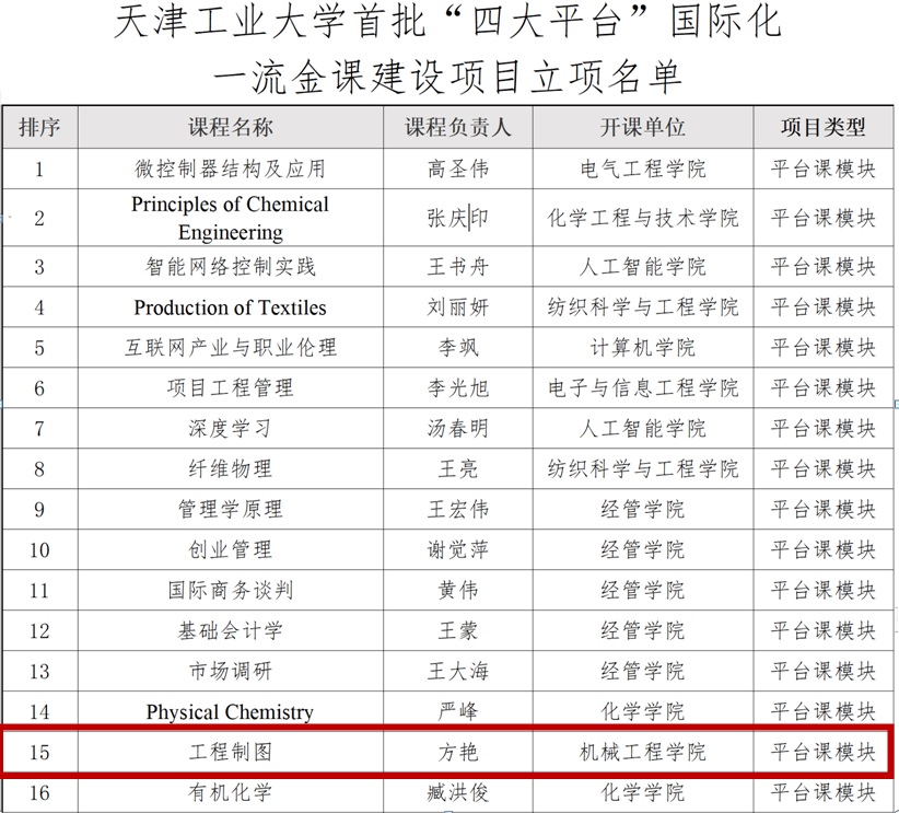 国际化一流金课等项目建设是推进我校国际化建设和留学生教育综合改革,提升“天工国际”课程云平台建设质量工作的重要举措。根据《关于开展“四大平台”一流金课建设项目的通知》精神,学校组织了首批“四大平台”国际化一流金课、国际化课程模块、国际化微专业等建设项目评选工作。经个人申报、学院推荐、学校审核后,我院方艳老师负责的全英文《工程制图》课程为“四大平台”国际化一流金课建设项目。